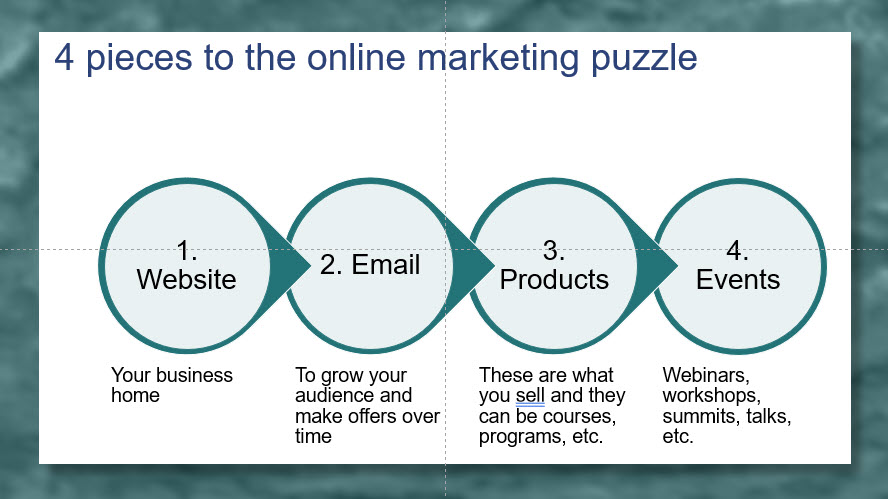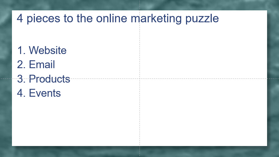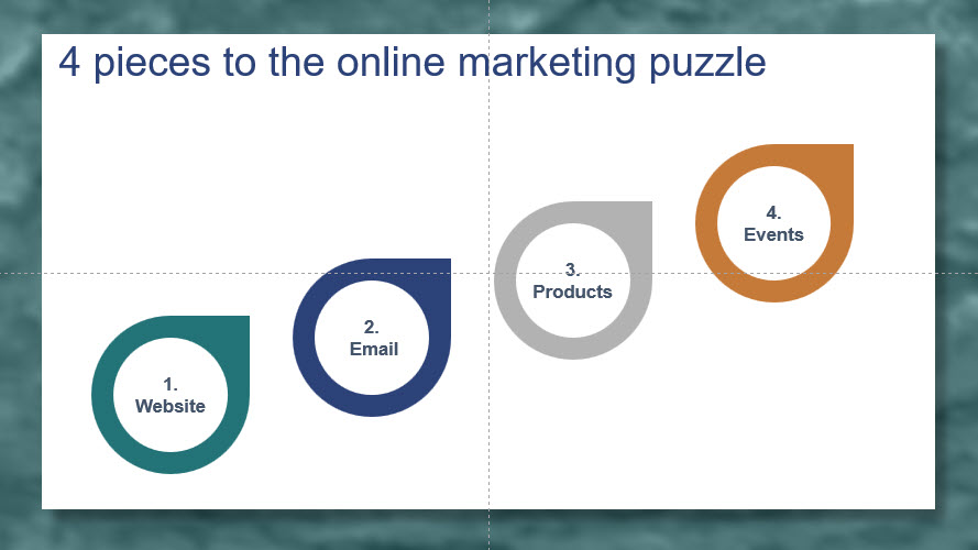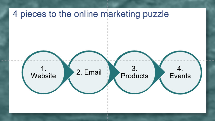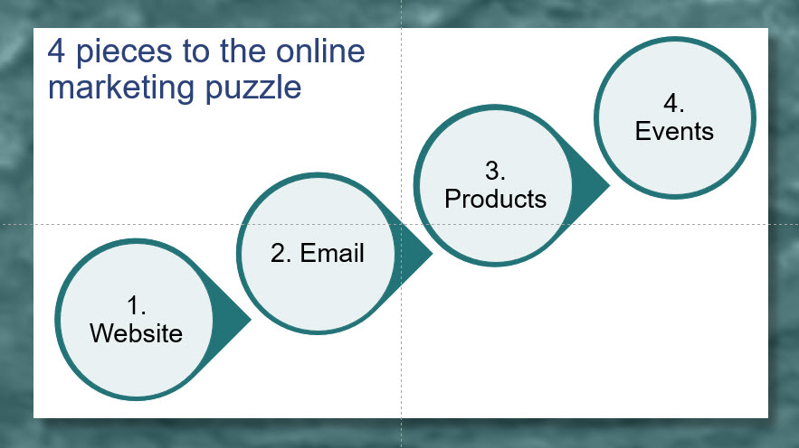 Let’s start with this slide, “4 pieces to the online marketing puzzle.” The 4 pieces are website, email, products, and events. But because I’m suggesting that this is a process, that is, you start by creating a website, then build an email list, and so on, it’s a process. You do one after the other.